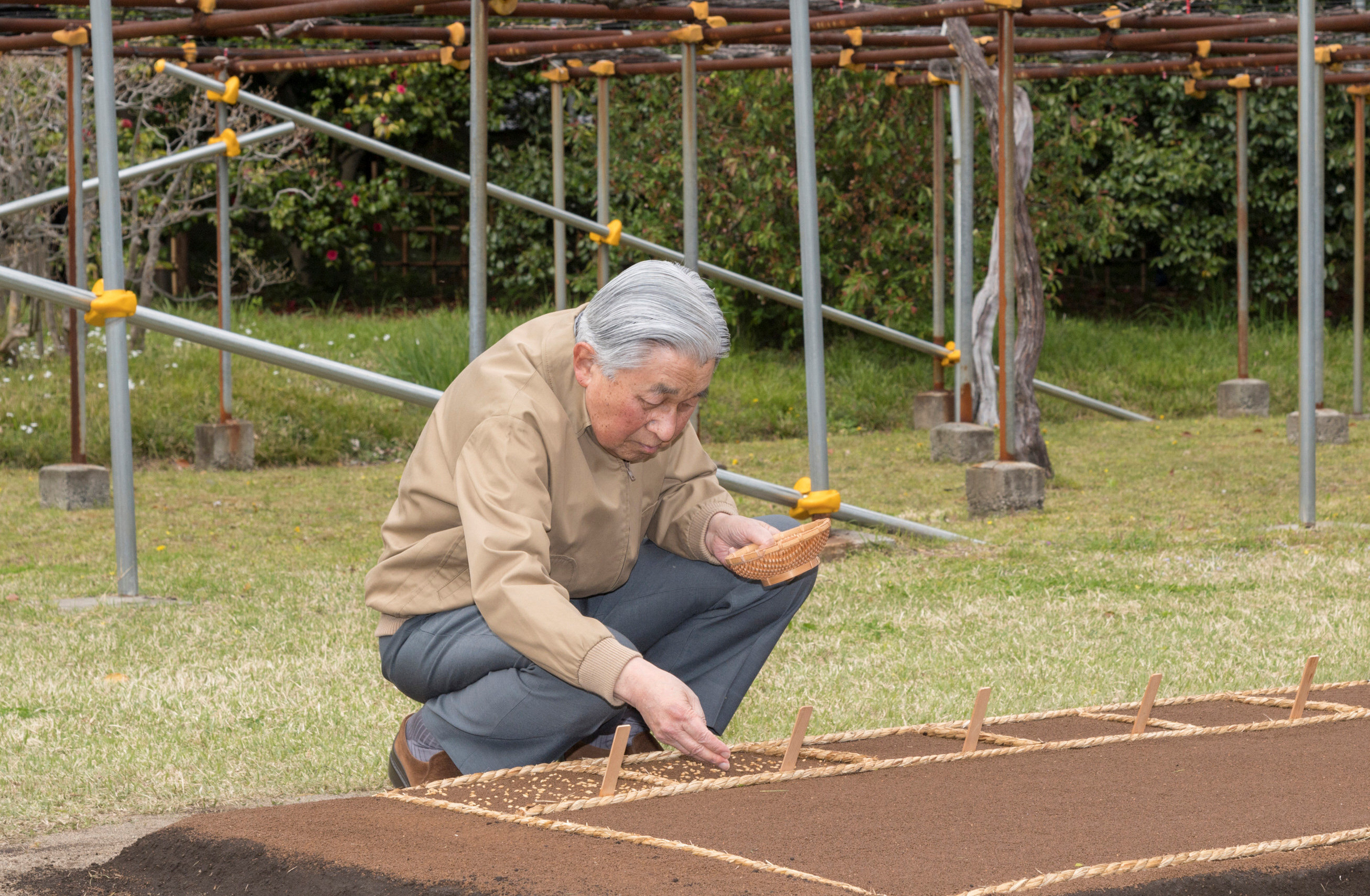 Arroz. Akihito sembrando semillas de arroz en un terreno del palacio imperial de Japón.