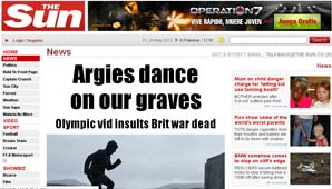 Buenos Aires, 4 de mayo.- La polémica por el spot del Gobierno en apoyo a los deportistas que participarán de los Juegos Olímpicos, y el reclamo por la soberanía de las Islas Malvinas, hizo el primer gran eco en la prensa británica en la tapa de The Sun.