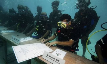 En ese insólito encuentro bajo el agua se firmó una declaración para pedir un mayor compromiso para abordar los riesgos del calentamiento global y la reducción de emisiones de los gases de efecto invernadero.