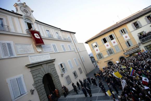 A través de cuatro pantallas montadas en lugares estratégicos de la plaza, peregrinos llegados de distintas partes del mundo siguieron las alternativas de la partida del papa, a bordo de un helicóptero, desde el palacio apostólico del Vaticano hacia la residencia de verano de Castel Gandolfo. Durante los 15 minutos que tardó el vuelo en recorrer los 30 kilómetros que separan ambas ciudades, las campanas de más de 300 iglesias romanas no pararon de repicar, dándole un marco imponente a las últimas horas del pontificado de Joseph Ratzinger.