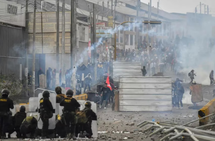 Grupos de manifestantes protagonizaron choques con la policía en su intento de llegar al Congreso, en el centro histórico de la capital, en tanto un grupo ingresó a la fuerza al aeropuerto de Arequipa, la segunda ciudad del país, con el saldo de un muerto tras una batalla campal con las fuerzas de seguridad.