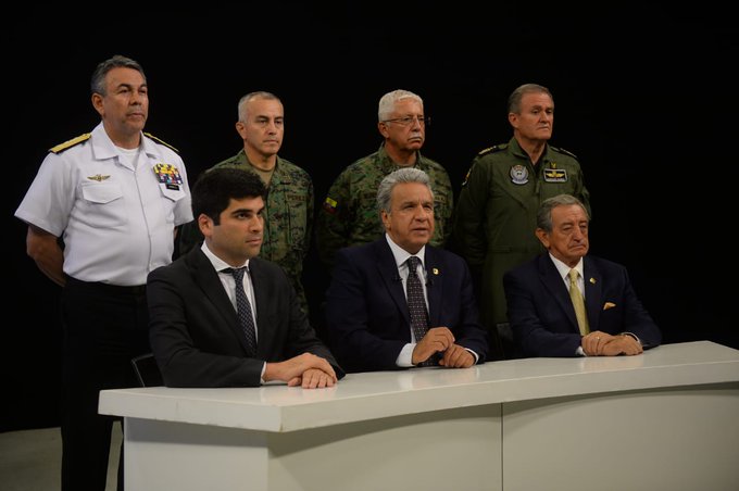 Moreno hizo el anuncio durante un discurso en el que estuvo acompañado de los titulares de los poderes del Estado. Éstos leyeron un comunicado conjunto para respaldar al mandatario y llamar al diálogo a todos los sectores sociales.
