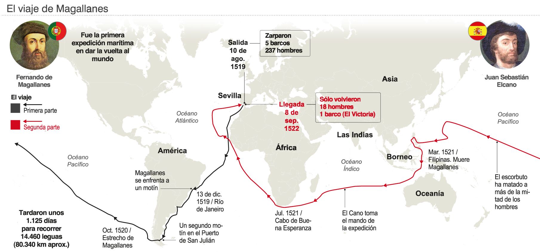 Así, fue uno de sus oficiales, el vasco Juan Sebastián Elcano, quien completó la vuelta al mundo, junto con los 18 supervivientes que lograron regresar al punto de partida en septiembre de 1522, a bordo del único barco que salió indemne de la hazaña, el "Victoria".