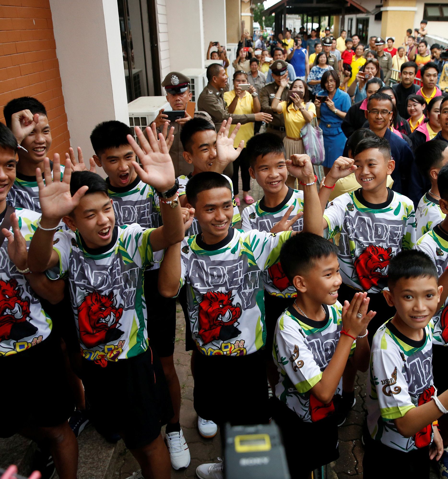 Los 12 niños y su entrenador de fútbol rescatados de una cueva inundada en Tailandia sonrieron y realizaron el tradicional saludo "wai" ayer en su primera aparición pública, en un acto retransmitido para todo el país desde la provincia septentrional de Chiang Rai. Médicos, familiares y amigos, algunos ataviados con el tradicional traje amarillo, saludaron a los niños, de entre 11 y 16 años, y a su entrenador de 25 años, que llevaban camisetas con un dibujo rojo de un jabalí.