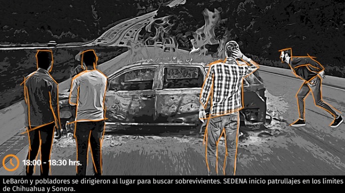 18:00 horas. LeBarón y pobladores se dirigieron al lugar para buscar a sobrevivientes.