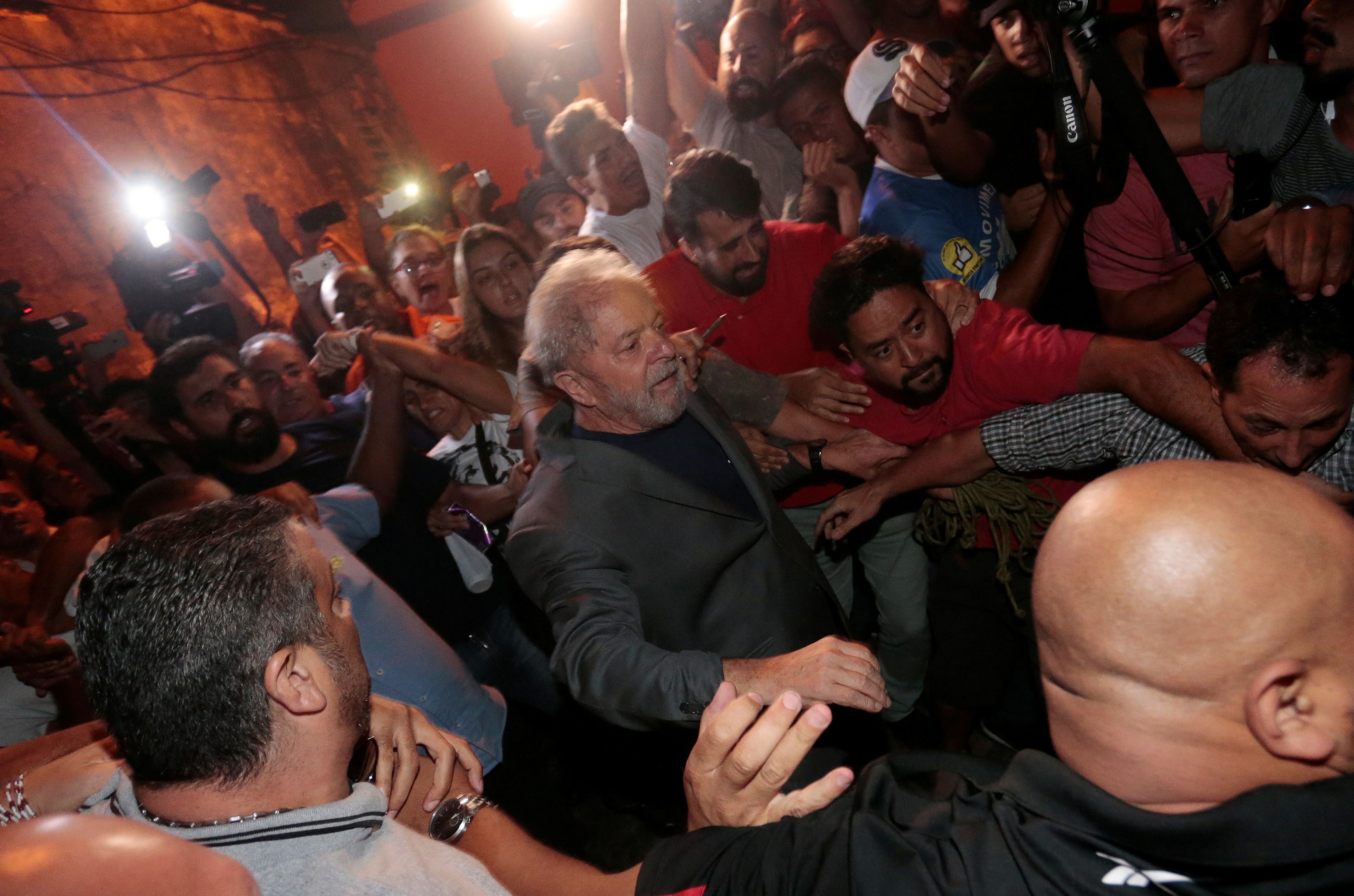Los vehículos prácticamente tuvieron que parar en el portón de la instalación policial por la aproximación de manifestantes, algunos gritando su apoyo al considerado líder más carismático de Brasil y otros festejando su detención.