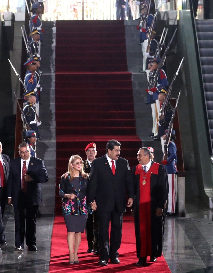 Contrariamente a lo que ordena la Constitución Bolivariana, la jura del mandatario se realizó frente al Tribunal Superior de Justicia dado que la Asamblea Nacional, con mayoría opositora, fue ilegalizada por el gobierno.