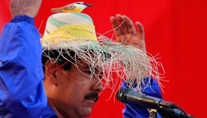 Venezuela, 10 de abril.- “Miren qué bonito, me lo regaló una compatriota de Nicaragua”, señaló el candidato presidencial del chavismo, Nicolás Maduro, en referencia a un sombrero de paja con un pajarito encima como reencarnación del fallecido Chávez, con el que se mostró durante un mitin en la capital de Venezuela.