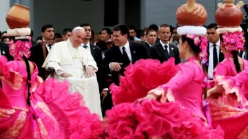 El Papa arribó ayer por la tarde al aeropuerto internacional de la capital paraguaya, Asunción, donde fue recibido bajo la lluvia por el presidente Horacio Cartes y el arzobispo asunceño, monseñor Edmundo Valenzuela.