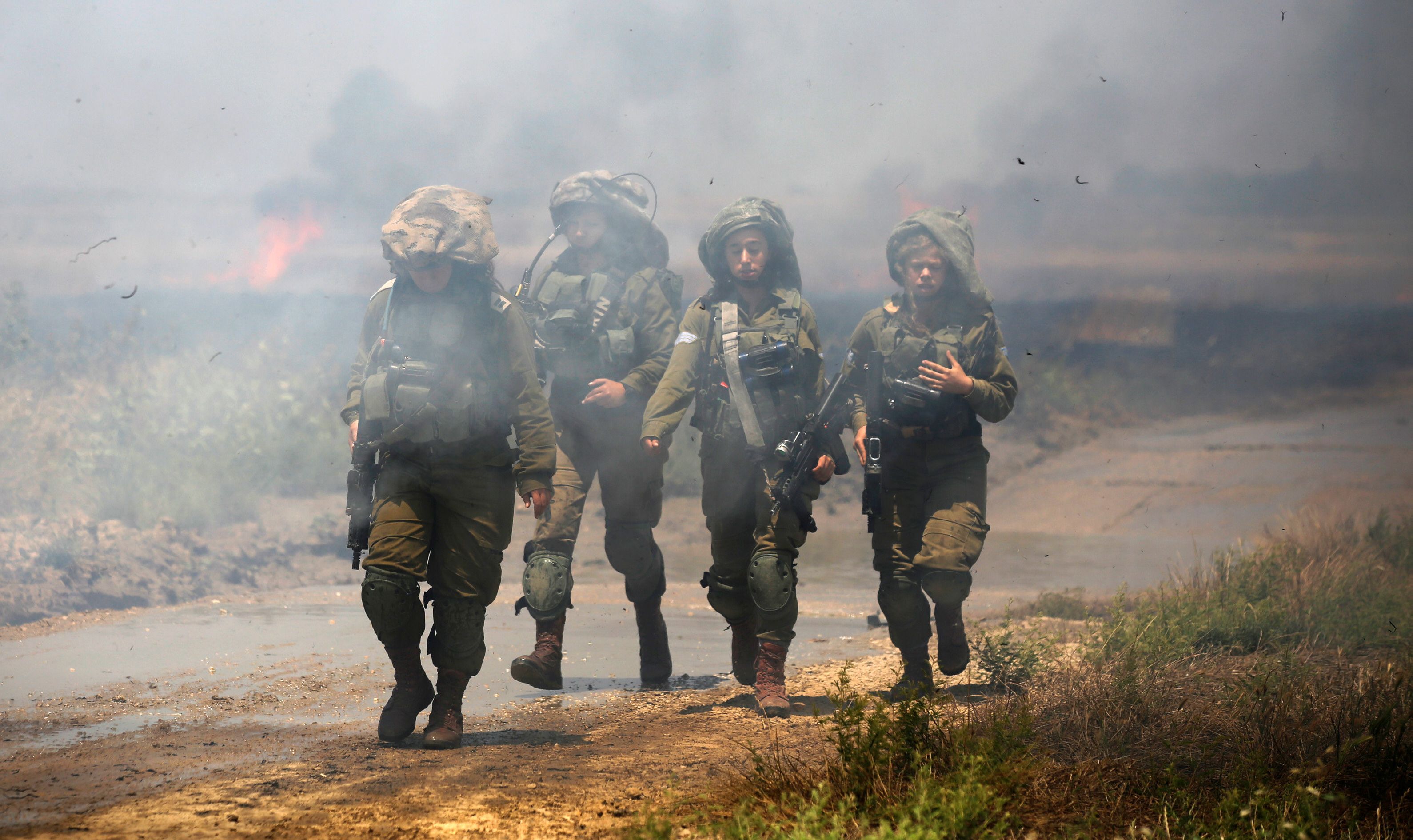 Terribles imágenes. Soldados israelíes patrullan cerca de un campo en llamas en el lado israelí de la frontera entre Israel y Gaza.