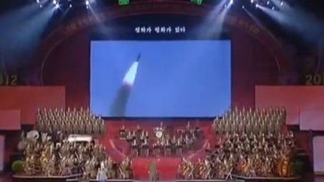 Según KCTV, la proyección acompañó la actuación de un coro vocal en el un acto programado para celebrar los 105 años del nacimiento de Kim Il-sung que se cumplieron oficialmente el 15 de abril.