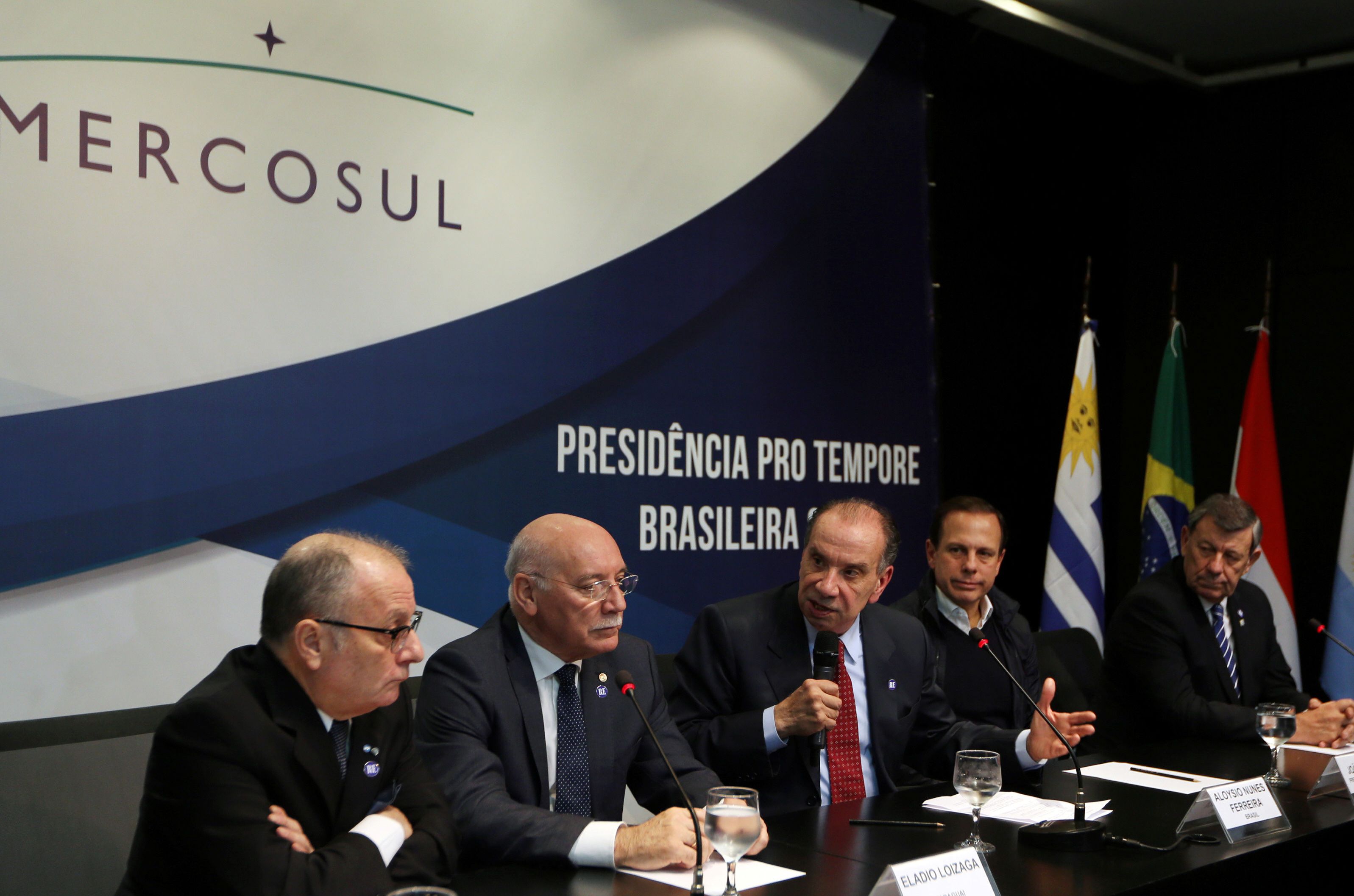 Juntos. De izquierda a derecha, el canciller de Argentina, Jorge Faurie; de Paraguay, Eladio Loizaga; de Brasil, Aloysio Nunes; el alcalde de Sao Paulo, Joao Dori y el canciller de Uruguay Rodolfo Nin Novoa en conferencia en Brasil.