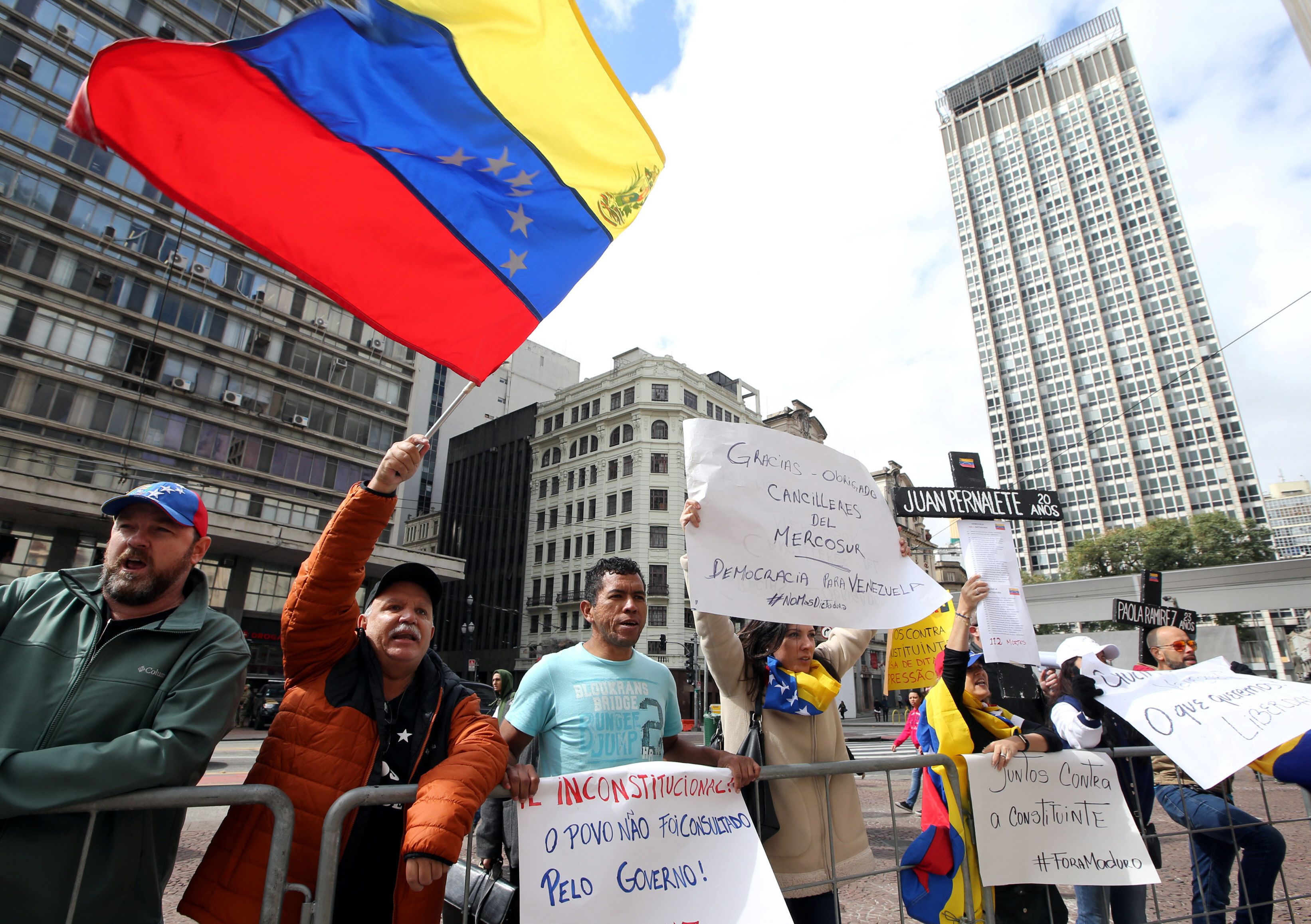 Protesta. Opositores al régimen de Maduro protestan durante el encuentro de los cancilleres en Sao Paulo, Brasil.