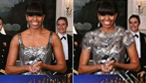 Una foto que publica el diario británico de Times muestra el retoque en photoshop que hizo la agencia oficial de noticias iraní Fars, para cubrirle los hombros y el escote.