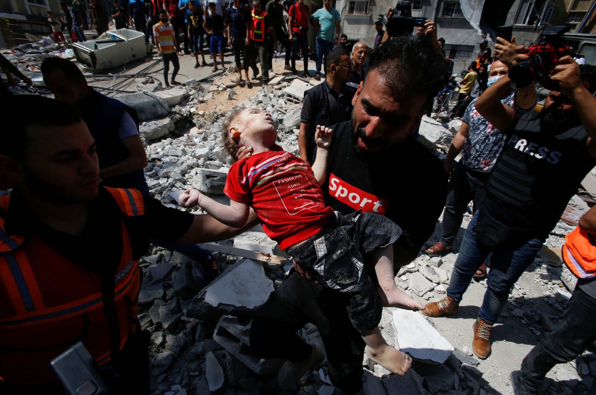 La muerte. La otra cara de la tragedia. A pocas cuadras del rescate milagroso el dolor se adueña de rescatistas y familiares de un niño alcanzado por el caos de las explosiones. Diez niños murieron el domingo en la Franja de Gaza.