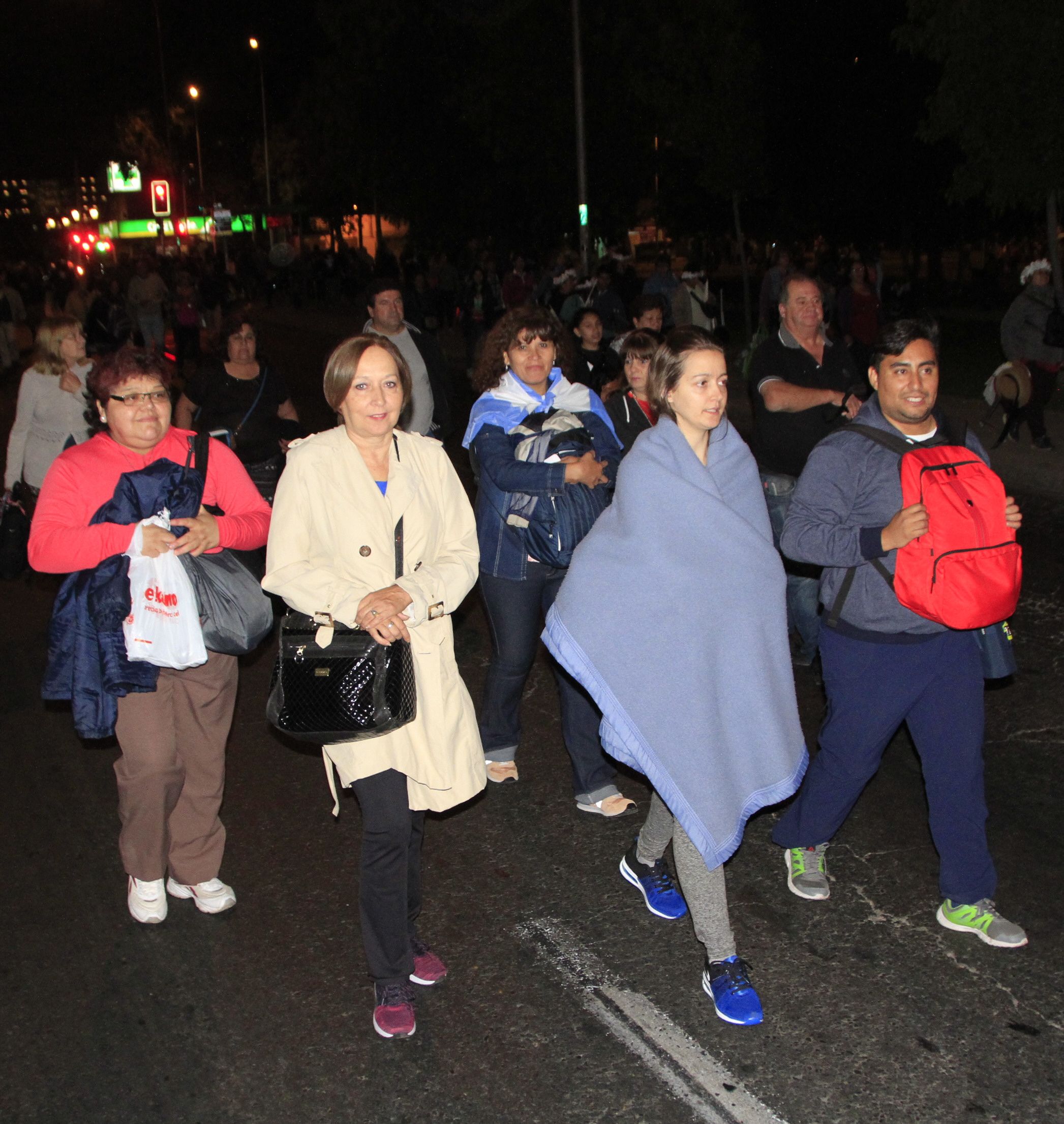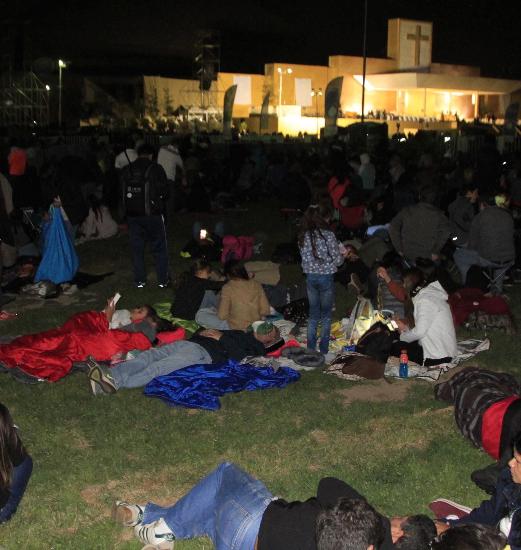 Los grupos de peregrinos llegaron con bolsacamas, colchones inflables, frazadas y hasta con recortes de nailon para que la humedad del pasto no les causara más frío. En todo el parque el césped cubre la superficie y eso hizo que todos pudieran estar cómodos tirados en el suelo. La noche comenzó agradable, pero con el paso de las horas, en plena madrugada a nadie le alcanzaban los abrigos. Algunos hasta buscaron las bolsas donde habían llevado botellas con agua para taparse y protegerse del frío. A partir de las 4 la temperatura bajó notablemente. Y aunque algunos se recostaron en el pasto, la noche se pasó bien y con mucho ánimo de fiesta. Cuando el sol comenzó a asomarse, y se distinguían con más facilidad los rostros de las demás personas, la alegría se dejó de ver. Es que hasta ese momento el frío no estaba dando respiro. Cuando el sol salió por completo todos comenzaron a untarse con los protectores solares y se pusieron gorras para estar lo más seguros posible. Es que el sol se hizo sentir con intensidad.