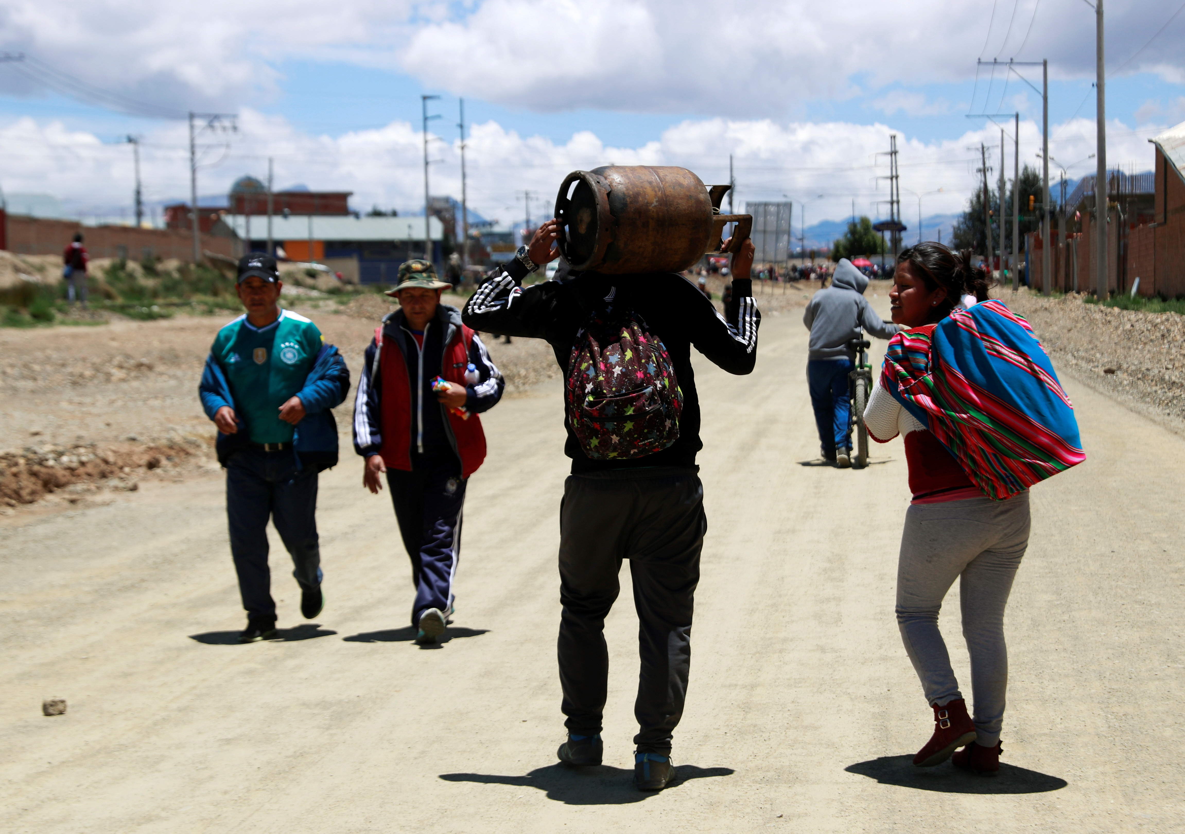 Cientos de bolivianos realizaron largas filas en las calles de La Paz ayer para asegurarse algunos alimentos indispensables y combustible, mientras partidarios de Evo Morales continuaban paralizando la red de carreteras del país, aislando a los centros urbanos de las granjas de los llanos. Un avión militar Hércules abasteció a los habitantes de la capital con un cargamento lleno de productos cárnicos desde la influyente zona de El Alto, evitando así las carreteras bloqueadas. Muchos en las regiones más pobres de La Paz optaron por cocinar con leña, ante las largas filas para conseguir gas licuado, cilindros de gas y la escasa comida.