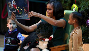 Estados Unidos, 25 de diciembre.- Bo, la mascota de la familia Obama se convirtió en el centro de atención durante la tradicional lectura de un cuento de Navidad, encabezada por Michelle Obama, en el Children’s National Medical Center de Washington.