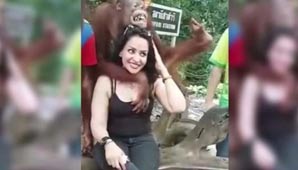 Un mono de un zoo tailandés se puso cariñoso con una visitante que posó junto a él para poder tomarse una fotografía. Pero el simio se pasó de vivo...
