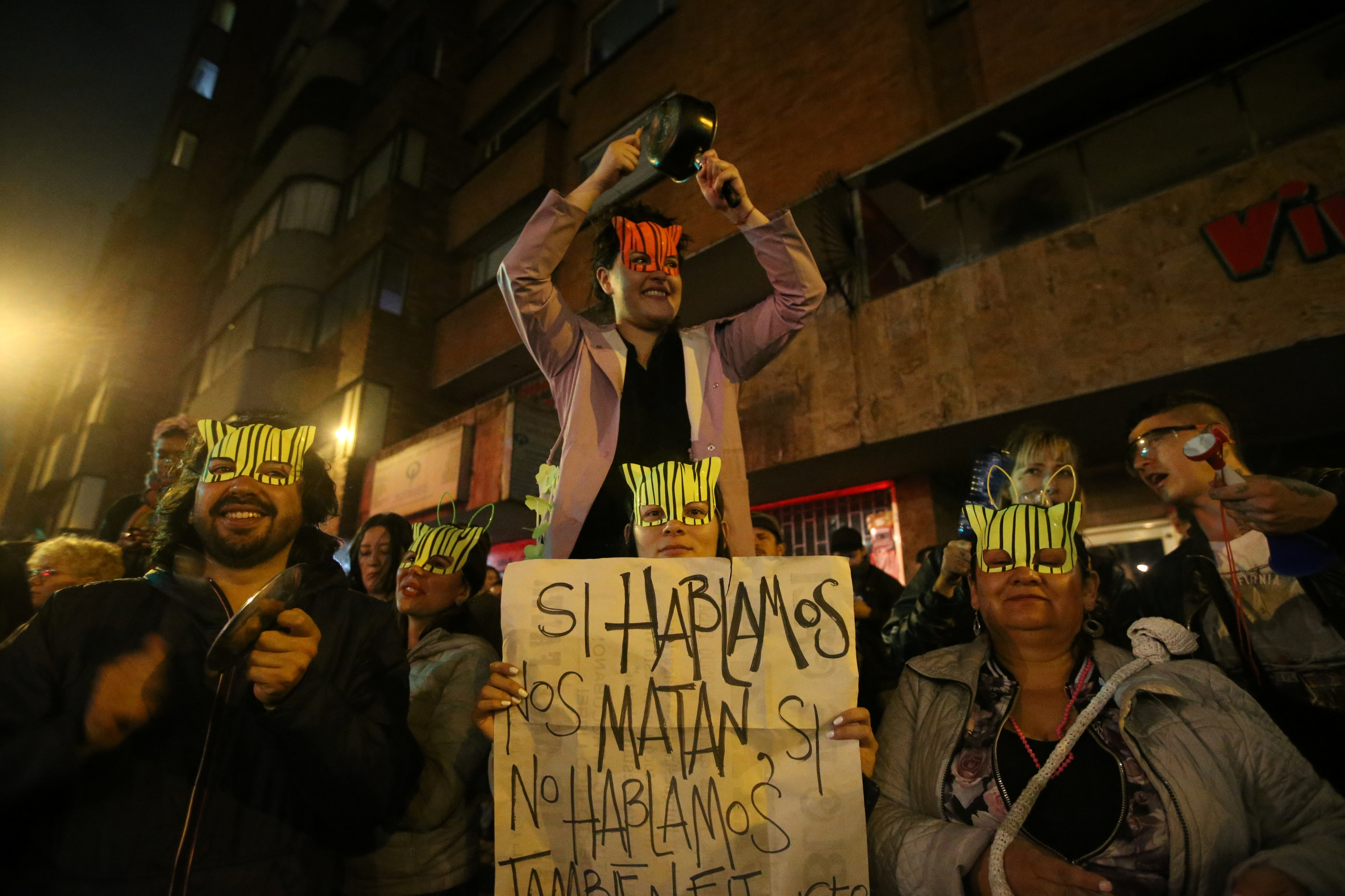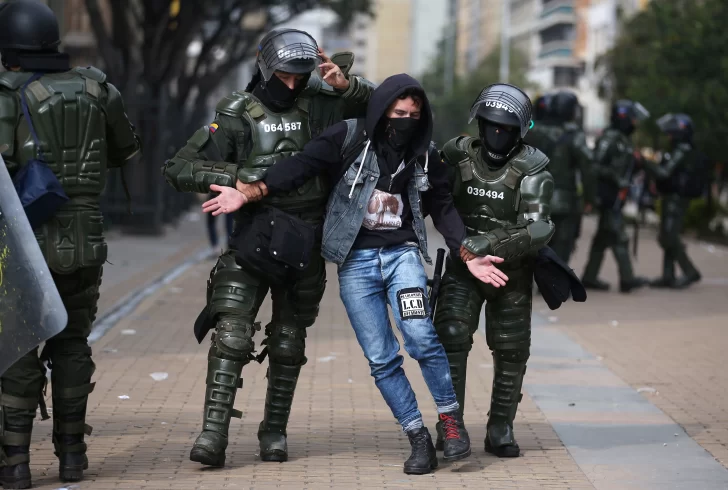 Las protestas de este sábado se iniciaron en el Parque Nacional, donde la policía dispersó con gases lacrimógenos a quienes participaban en un nuevo cacerolazo, que después se dirigieron a la céntrica Plaza de Bolívar, de donde también fueron obligados a retirarse.Después de que el joven herido fue llevado al hospital, los manifestantes rodearon con piedras el lugar en el que cayó y pusieron una tela negra con letras blancas en las que se leía “Con el miedo de mi familia no se juega. Resistencia”.