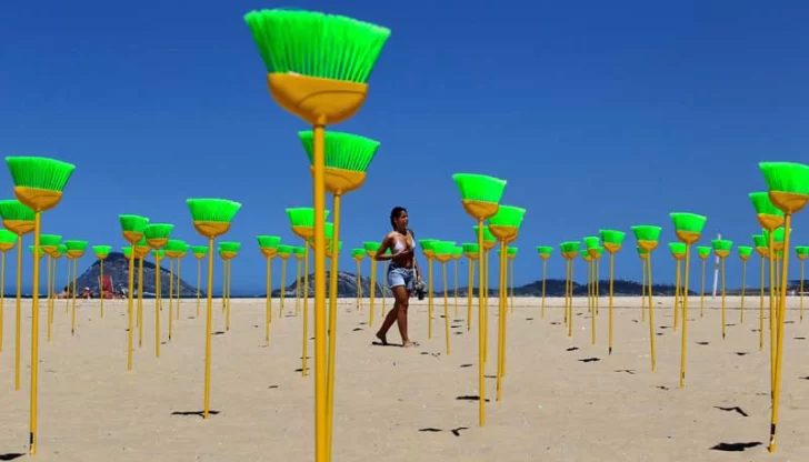 Las escobas, con el palo pintado de amarillo y las cerdas verdes, los colores de la bandera nacional, ocuparon una extensa área de la playa y formaron varias columnas tras dos escobas colocadas junto a dos baldes, un conjunto que hacía referencia a la forma de la sede del Congreso de Brasil.