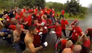Los hooligans, alrededor de 100, llegaron a la cita preparados hasta con muñequeras y se pegaron a mano limpia, sin la ayuda de objetos contundentes como palos, cadenas, piedras o armas de fuego.