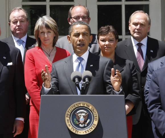 Obama hizo el anuncio desde el Rose Garden de la Casa Blanca, acompañado por funcionarios del sector, ejecutivos de las automotrices, legisladores y algunos destacados gobernadores, entre ellos el de California, Arnold Schwarzenegger.