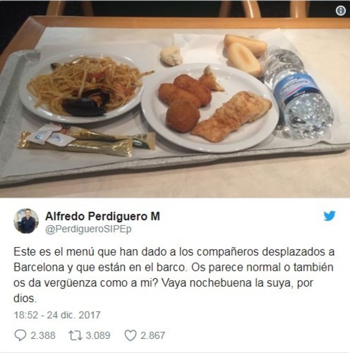 “Menú de Navidad de nuestros policías desplazados a Catalunya, defendiendo el Estado de derecho lejos de sus familias. A los delincuentes se les dispensa mejor trato”, aseguró ayer en su cuenta de Twitter el SUP en alusión al menú especial servido en la cárcel madrileña de Estremera a todos los internos, entre ellos al ex vicepresident de la Generalitat Oriol Junqueras, que constaba de consomé, merluza y un surtido de dulces navideños.