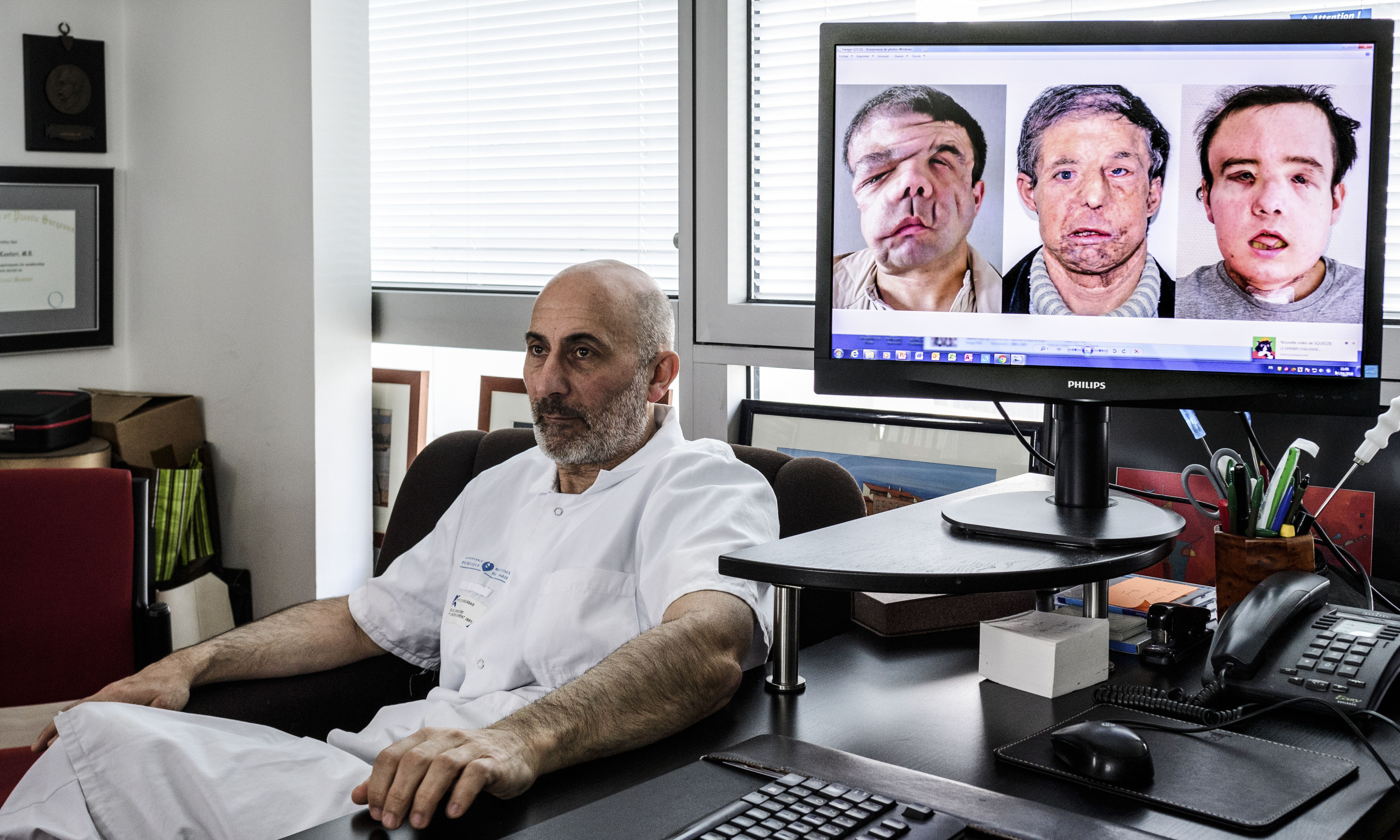 Diferentes pasos. El profesor de medicina francesa Laurent Lantieri, especialista en trasplante de mano y rostro, posa al lado de una pantalla que muestra los diferentes pasos de la cirugía de su paciente Jérôme.