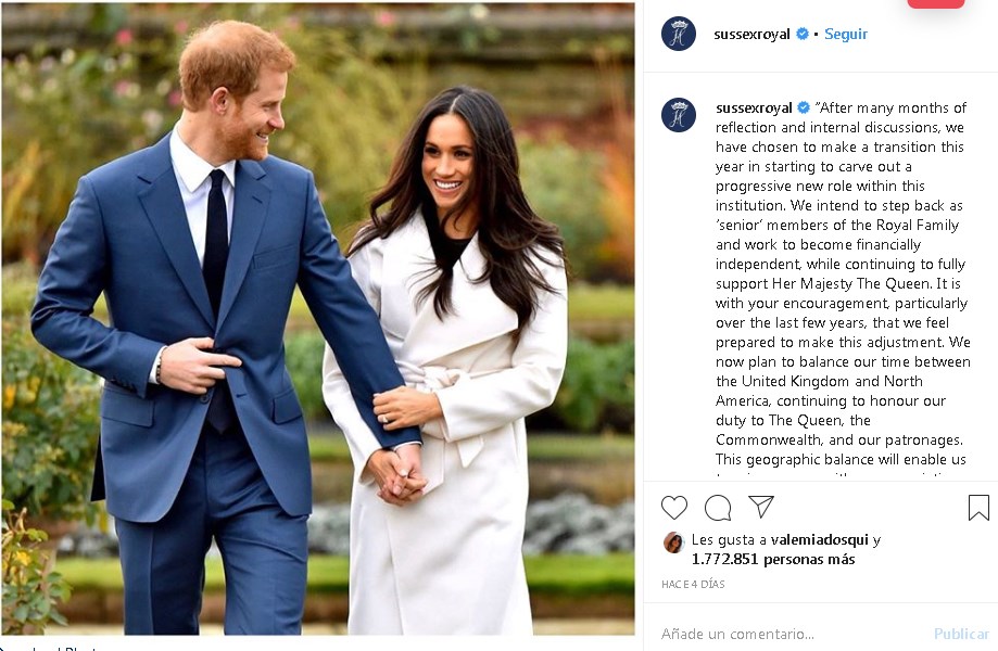 Este miércoles, en un texto que publicaron a través de su cuenta Instagram, los duques de Sussex renunciaron a su rol en la familia real británica. "Tenemos la intención de dar un paso atrás como miembros seniors y trabajar para ser financieramente independientes", sostuvieron.
