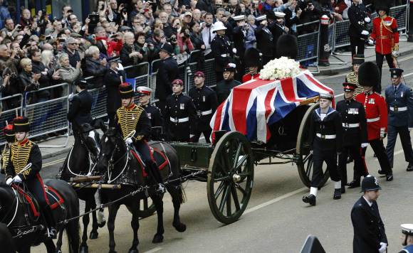 Miles de seguidores salieron a las calles de Londres mientras el ataúd de Thatcher realizaba su viaje final hacia la Catedral de San Pablo. Ocho militares cargaron su ataúd en hombros para ingresarlo en la Catedral para un servicio fúnebre al que asistieron 11 primeros ministros de todo el mundo.