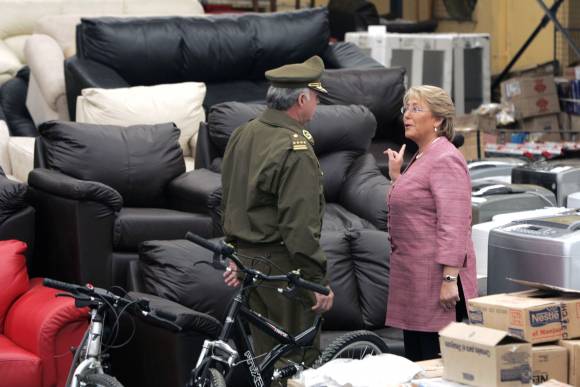 "Lo que se ha recuperado es de aproximadamente mil millones de pesos (1,92 millones de dólares)", dijo la mandataria durante una visita a la bodega en la que los carabineros acumulan los elementos recuperados, en Concepción, una de las ciudades más afectadas por el sismo de 8,8 grados Richter que devastó el centro y Sur de Chile.