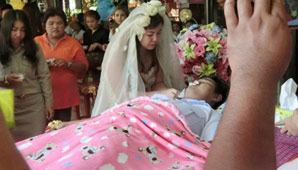 Nan Thippharat, de la provincia de Chachoengsao, acompañó a su esposo muerto durante su propio velorio, usando el vestido que planeaba ponerse para el casamiento.