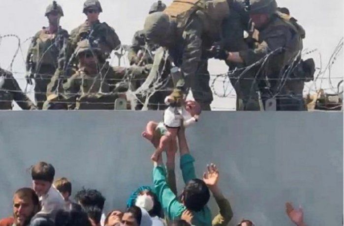 Las imágenes de madres entregando a sus pequeños hijos a los marines estadounidenses para que los saquen de Afganistán tras la toma de poder por parte de los talibanes conmueven al mundo. Una de ellas particularmente, en la que se puede ver como un marine toma un bebé por sus ropas y lo pasa del otro lado del muro del aeropuerto de Kabul causó estupor este viernes.