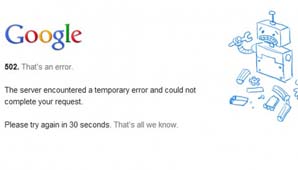 Buenos Aires, 23 de Octubre.-Varios usuarios experimentaron problemas al intentar acceder al sitio del correo electrónico de Google, Gmail, esta mañana, desde hace alrededor de una hora. La página muestra un mensaje de error ("502. Ese es un error"), al tiempo que insta a los usuarios a volver a intentar loguearse en 30 segundos. Hangouts también experimenta inconvenientes.