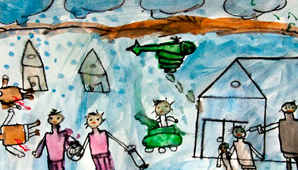 El programa realizado por una ONG que alberga a familias que escaparon del país, refleja el horror de la guerra vista por niños de 9 a 13 años. Dibujos impactantes