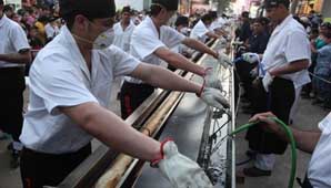 La salchicha, de 203,80 metros de largo y 120 kilos, fue elaborada por unas doscientas personas que trabajaron por más de cinco horas y que también hornearon un pan de similar longitud y 145 kilos para acompañarla.
