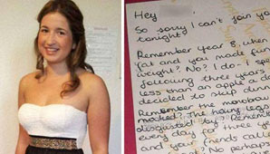 ¿Recuerdas la uniceja de la que te burlabas? ¿Las piernas peludas que te disgustaban? ¿Recuerdas cómo cada día por tres años tú y tus amigos me llamaban Manbeast (hombre bestia)? No, quizás no lo haces – o no me habrías visto mi aspecto ocho años después y considerado lo suficientemente atractiva para tratarme como un ser humano.