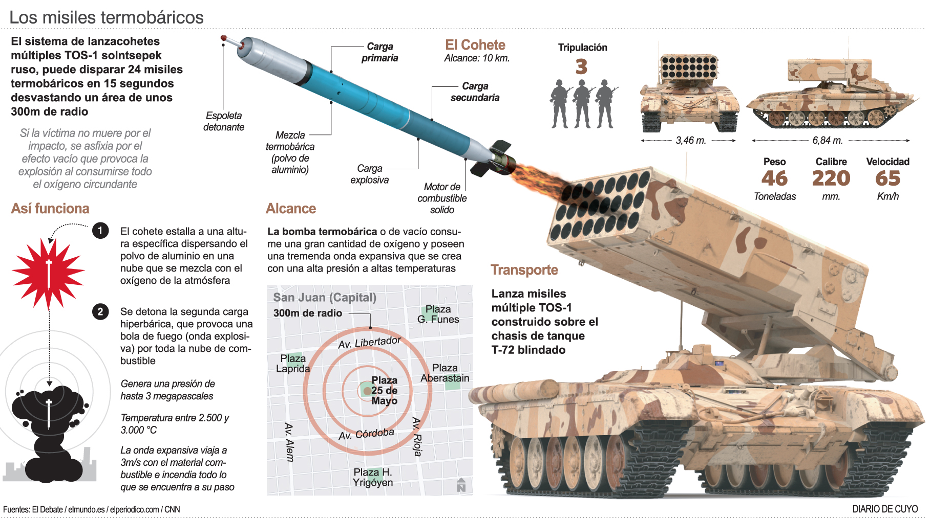 Las también denominadas bombas de vacío "son usadas especialmente contra fortificaciones, túneles y cuevas, ya que la presión y las partículas explosivas se adentran durante un largo tiempo en los espacios reducidos, provocando efectos devastadores en las personas en su interior", indicó CNN.