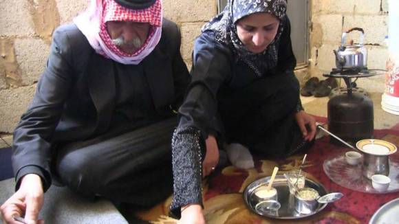 En medio de esta desolación, un grupo de vecinos y familiares del campamento de Abu Nur se reúne en una de las tiendas para visitar a un enfermo. Una mujer llega con una bandeja para servir café y té, y en medio de las tazas aparece una bombilla y un mate.