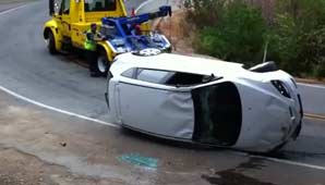 El dueño del auto chocó y volcó. Cuando llegó la grúa dio vuelta el auto, que terminó peor de lo que lo encontró. Mirá el insólito video.
