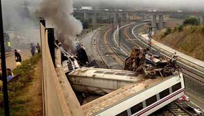 El tren Alvia descarriló el miércoles en la entrada a la estación de Santiago de Compostela, capital de Galicia, en la línea que une Madrid y Ferrol. Cuatro vagones quedaron completamente dados vuelta, y tres de ellos se prendieron fuego.
