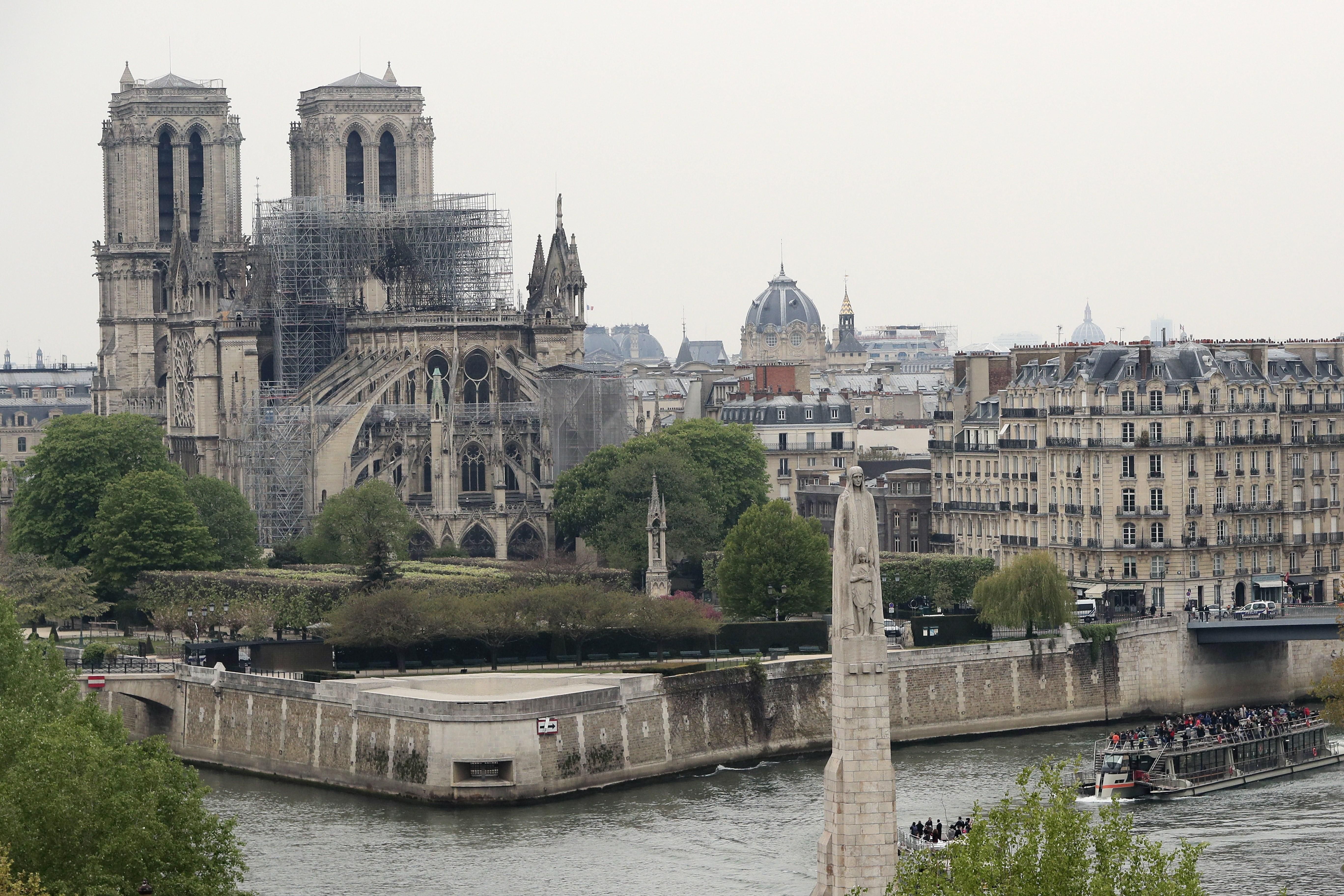 El vocero de los bomberos de París Gabriel Plus anunció que después de un enorme esfuerzo lograron apagar el fuego y que actualmente trabajan en la fase de peritaje. Plus habló de un balance material "dramático": "todo el tejado está siniestrado, toda la armadura quedó destruida, una parte de la bóveda se derrumbó, la aguja ya no existe", se lamentó. A pesar del desastre las dos torres emblemáticas se mantuvieron en pie, así como el gran rosetón de la fachada sur.