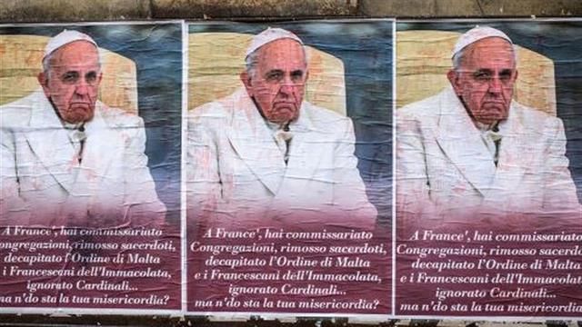 Roma amaneció ayer empapelada con afiches anónimos contra Francisco. "Has comisariado Congregaciones, removido sacerdotes, decapitado la Orden de Malta y los Franciscanos de la Inmaculada, ignorado Cardenales.. ¿dónde está tu misericordia?", se preguntan los carteles que con el rostro del pontífice se ven en las cuadras de los alrededores del Vaticano.