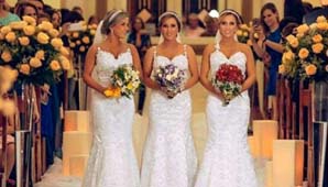Brasil, 7 de abril.- Entraron a la Iglesia y caminaron hacia el altar mientras parecían una persona triplicada. Se trata de Rafaela, Rochele y Tagiane Bini, unas trillizas brasileñas que se casaron al mismo tiempo y usando el mismo diseño de vestido, el mismo peinado y hasta el mismo maquillaje.