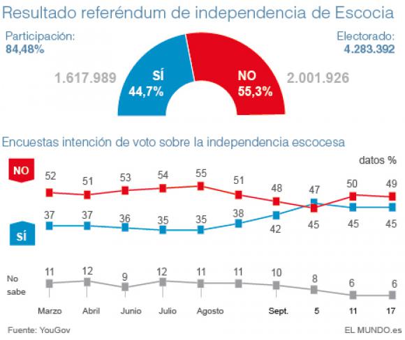 Buenso Aires, 19 de septiembre.-Los resultados fueron dados a conocer pasadas las dos de la mañana de nuestro país. Escrutados 31 de los 32 distritos electorales el "No" superaba con el 55.42% de los votos al "Sí", que alcanzó el 44,48%.
