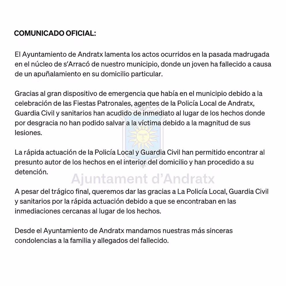 Tras el crimen, el Ayuntamiento de Andratx publicó un comunicado en el que lamentó la muerte del joven. “Gracias al gran dispositivo de emergencia que había en el municipio debido a la celebración de las Fiestas Patronales, agentes de la Policía Local de Andratx, Guardia Civil y sanitarios han acudido de inmediato al lugar de los hechos donde por desgracia no han podido salvar a la víctima debido a la magnitud de sus lesiones”, expresaron.