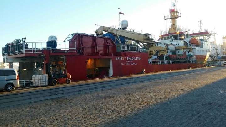 La presencia ayer en el puerto de Montevideo del buque de la British Antartic Survey, Ernest Shackleton, generó la atracción de entendidos. Se trata de un buque que carga combustible y pasajeros, y que también se usa para investigación. Lo singular es que está claramente identificado como un buque que viaja “con bandera de las Islas Falkland”.