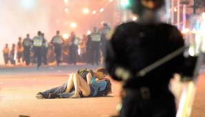 Buenos Aires, 17 de junio.- La foto fue tomada en Vancouver en medio de los violentos disturbios generados tras un partido de Hockey. Su autor estaba allí para retratar el caos cuando captó a esta pareja que yacía en la calle “entre la policía antidisturbios y un espectacular incendio". Nadie sabe quiénes son ni por qué lo hicieron, pero esta imagen parece ser una dura competidora de aquella tomada en agosto de 1945 en Times Square (Nueva York) en la que un marine que besa apasionadamente a una enfermera.