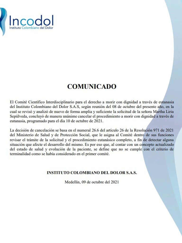 “Según reunión en la cual se revisó y analizó de nuevo de forma amplia y suficiente la solicitud de la señora Martha Liria Sepúlveda, concluyó de manera unánime cancelar el procedimiento a morir con dignidad a través de eutanasia, programado para el día 10 de octubre de 2021″, señala en un comunicado la IPS.